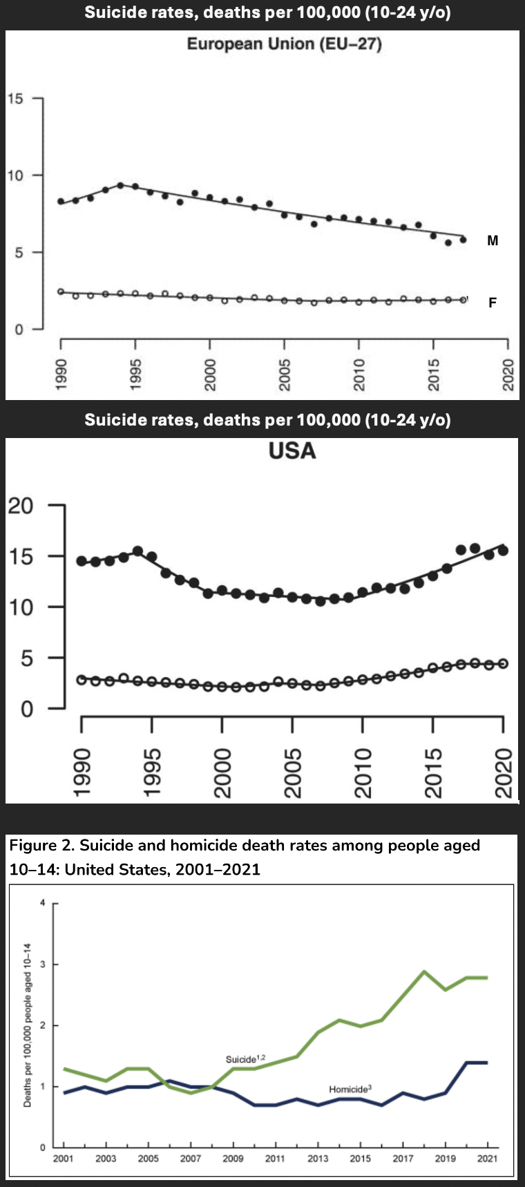 In the US, suicide rates among teens and young adults are 3X higher than in the EU. In the US, suicide rates have risen since 2000; in the EU, suicide rates have fallen since 2000. In the US, the recent increase in suicides among the youth has been driven by an especially sharp spike among preteens.