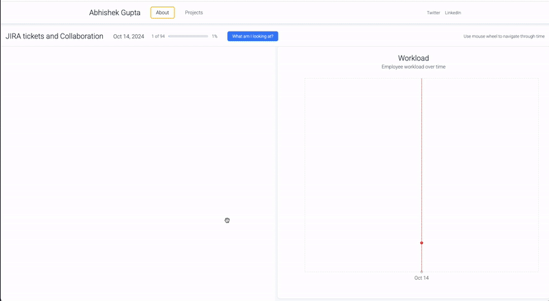I tracked how JIRA tickets moved across my development team to understand collaboration patterns and identify bottlenecks. This animated force-directed graph shows tickets clustering by assignee, with lines connecting blocking dependencies between team members.