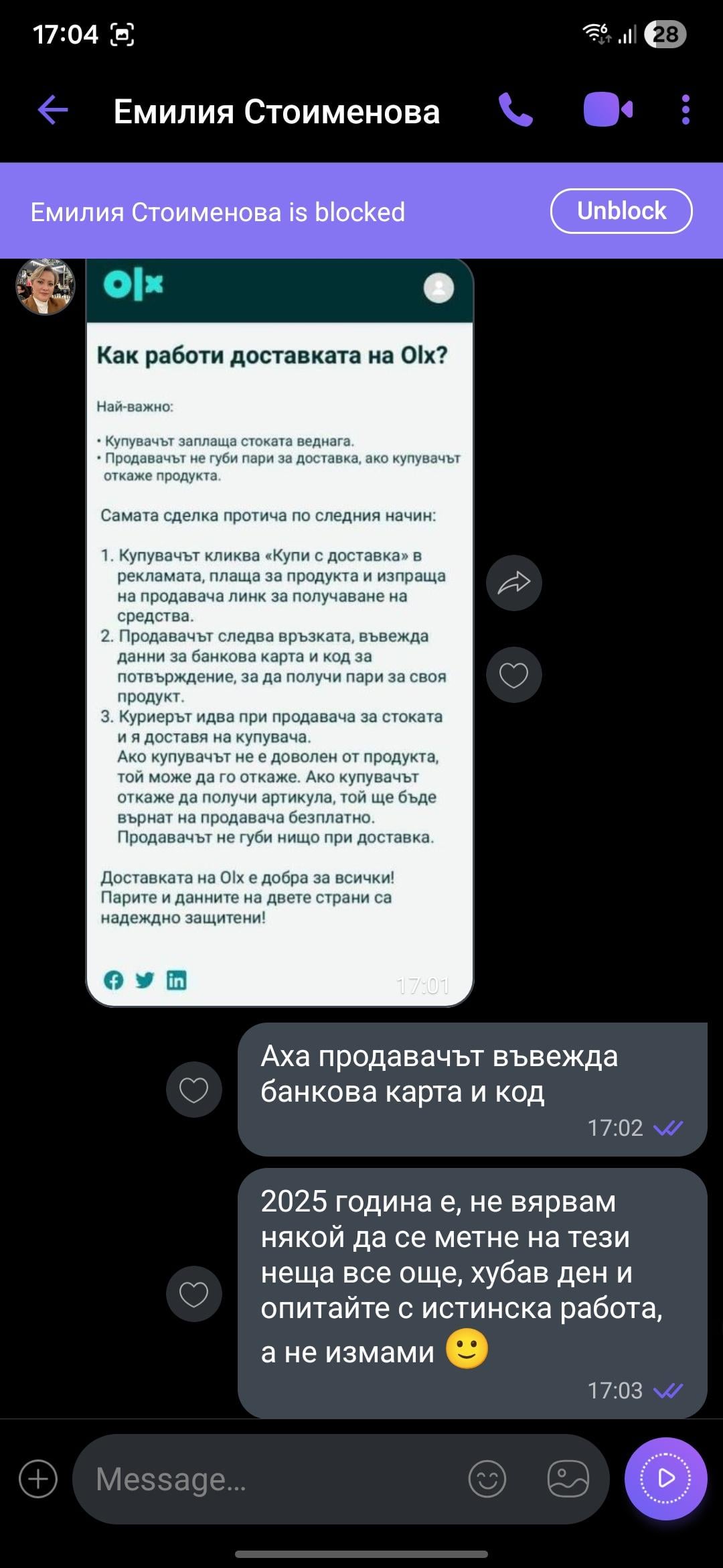 И на мен ми пишат. Когато видя съобщение във Вайбър за обява в OLX, веднага блокирам.