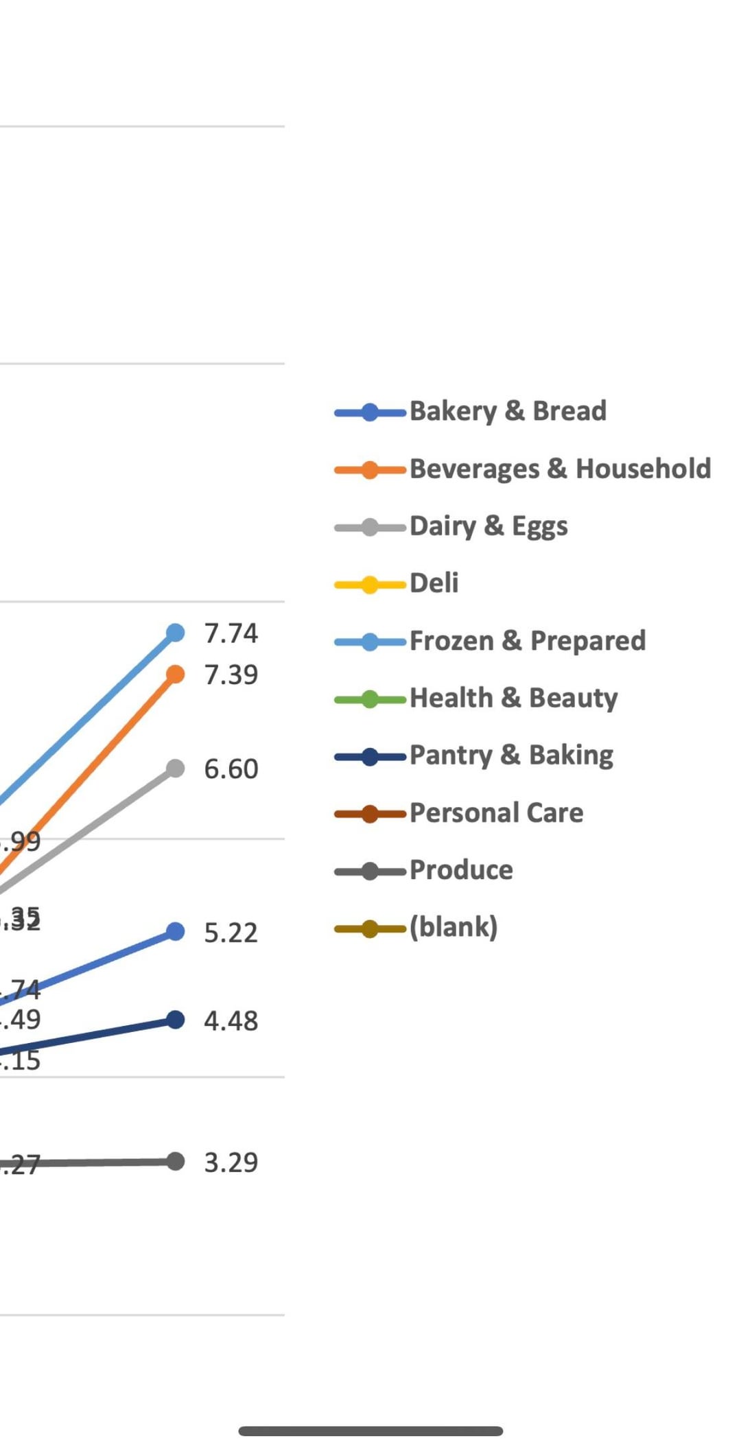Here are the data charts for each category and subcategory. The X axis represents the month/year of purchase and the Y axis represents the average cost of items in that category.