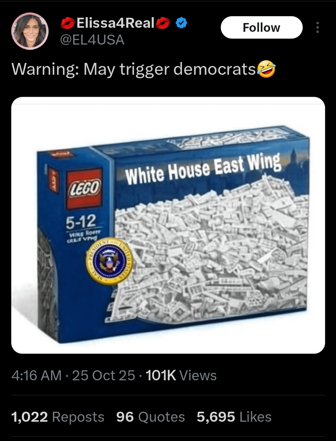 Imagine telling on yourself like that. “lol only DEMOCRATS would care that a large portion of the presidential residence, a symbol of the United States itself, was unceremoniously demolished.”