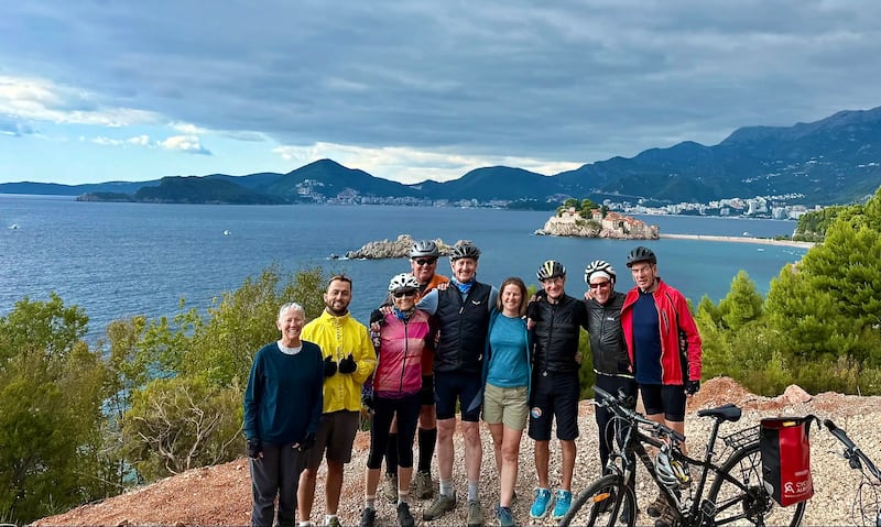 Standing on a vista overlooking Budva, Montenegro, Lorena Knapp (in the middle with blue top) poses with her cycling group from Cycling Albania on their “Balkan Express” trip. (Photo courtesy Lorena Knapp)