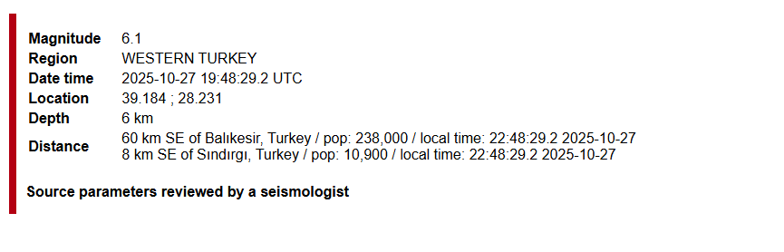 Силно земетресение с магнитуд 6,1 по Рихтер разлюля Западна Турция. Дълбочината на труса е 10 км. Епицентърът е на 29 км от Маниса, 8 км югоизточно от Съндъргъ и на 60 км югоизточно от регионалния център Балъкесир. Земетресението е станало в 21.48 ч. местно време. По данни на Европейския сеизмологичен център трусът е усетен в България и Гърция.