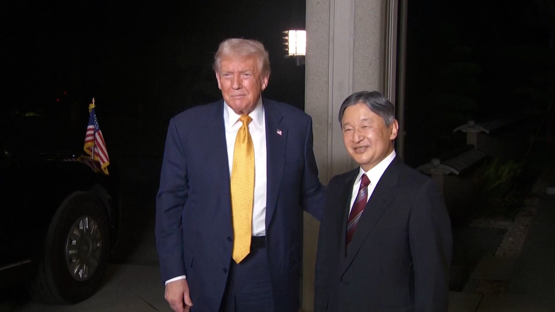 President Donald Trump arrived in Japan to meet with Emperor Naruhito and Prime Minister Sanae Takaichi to discuss trade, investment and defense.