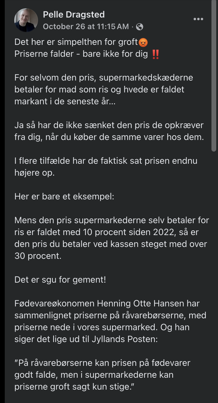 Det, der virkelig ville hjælpe med at få fødevarepriserne ned i Danmark, er at ændre planloven, så kæmpestore supermarkeder bliver lovlige. Det er helt godnat, at vi værner om de små butikker, når de “små” butikker reelt er små Netto’er, Rema’er osv. – altså små butikker ejet af store organisationer.