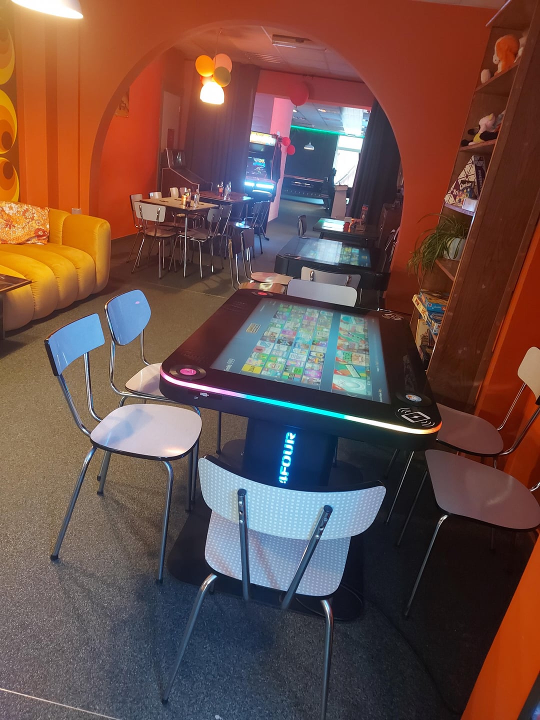 Om het hoekje hebben ze nog iets staan wat ik enkel kan beschrijven als 2 grote iPad tafels met een paar 100 spellen op. Er staat een spel op dat sommige hier misschien nog wel in een of andere vorm herinneren, Space Towers. Een vorm van "patience" waar je zo snel mogelijk de toren met kaarten moet wegspelen om een hoge score te halen. Als je op de linkse kast in de top 100 of op de rechtse in de top 10 kan geraken, dan krijg je er een gratis drankje van de baas normaal. Moeilijker dan het lijkt maar wel een leuke uitdaging. Er zaten daar 8 mensen continue dat spel te spelen. (Je kan met 4 tegelijk spelen)