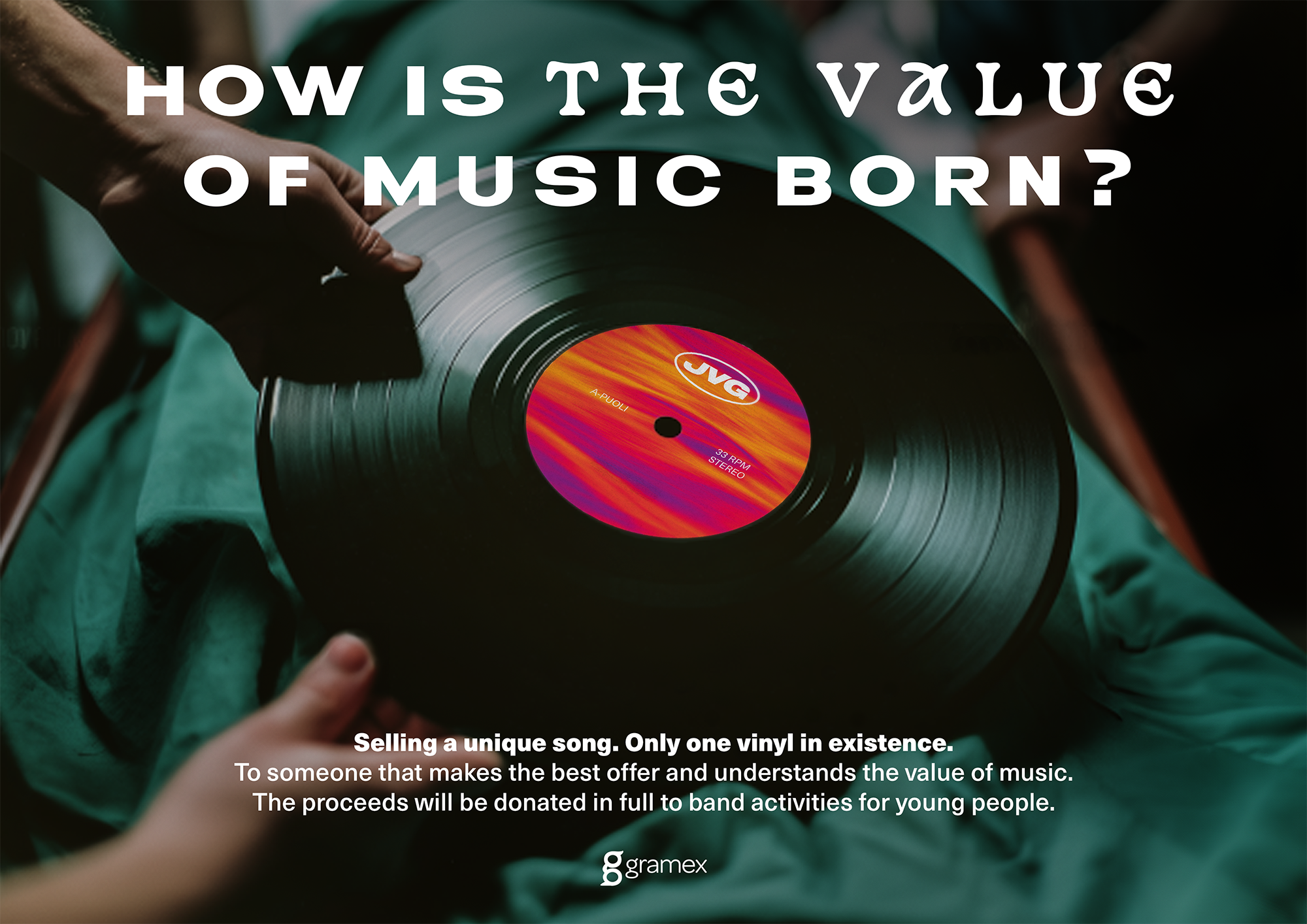 Gramex, the copyright society of recorded music in Finland, and the rap duo JVG, one of Finland’s biggest artists ever, have launched an unprecedented campaign, offering the artist’s new song for sale as a single, unique vinyl record – a first in Finnish history. All proceeds from the sale will be donated in full to band activities for young people.
