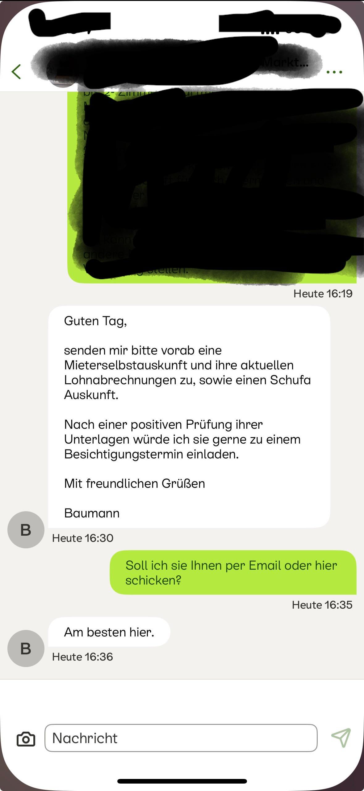 I am searching for a new appartment and answered to his listing on Kleinanzeigen. He is asking me to send him my documents on this platform which I find strange (no one until now has asked me this). Is it okay to send them here or is this behaviour a red flag? Do I need to ask him something else’? The price for this offer is relatively good tbh.