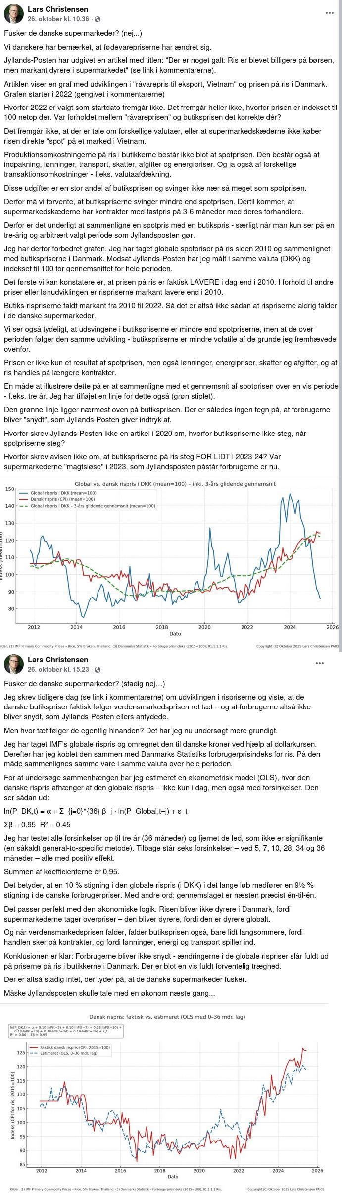 OBS! DISCLAIMER: Jeg har ikke slået det her med supermarkedernes resultater op, jeg nævner det fordi jeg mindes at det var fremme tidligere på året i nyhederne at supermarkederne havde leveret gode overskud og vækst. Der er helt sikkert en risiko for at jeg tager fejl. Jeg nævner bare muligheden for at det måske kun er for nogle fødevarer (som ris), at vores priser er “fair”, hvor ideen omkring at supermarkederne har “glemt” at skrue priserne ned igen efter de steg, på et tidspunkt, måske ikke er forkert for andre fødevarer.