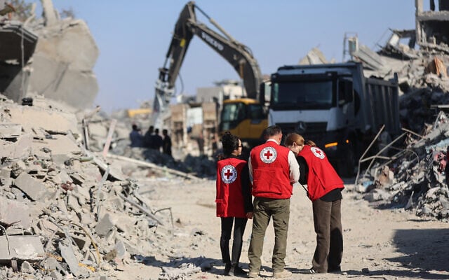 Members of the Red Cross observe an operation to recover the body of a hostage in the al-Tuffah neighborhood of Gaza City on October 27, 2025. (Omar AL-QATTAA / AFP)