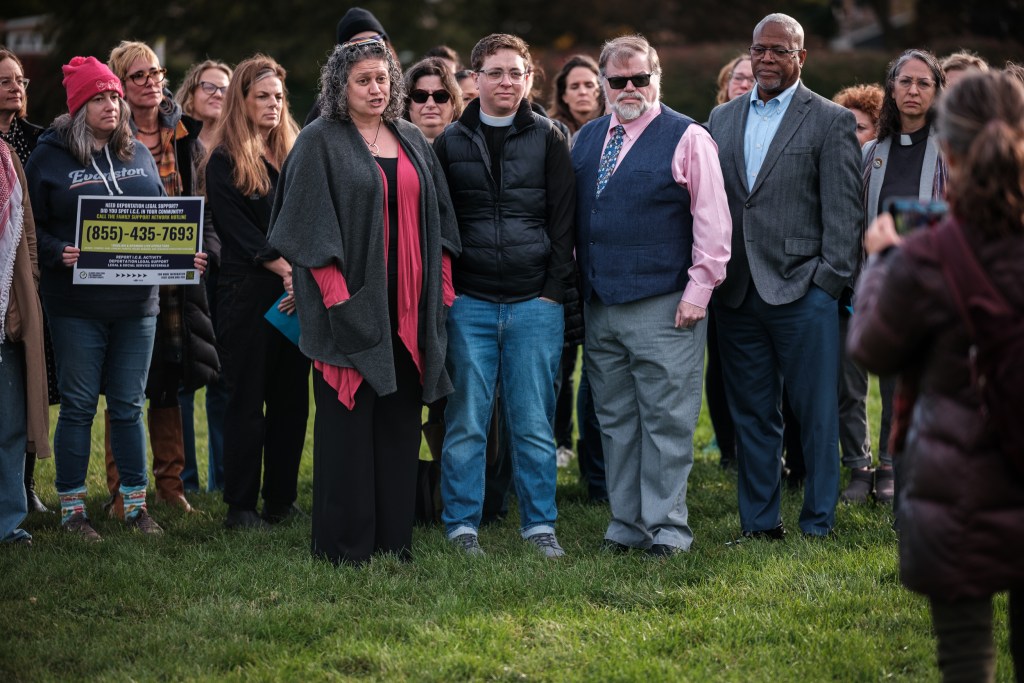 Evanston business owners, nonprofit leaders and clergy convened Tuesday morning at James Park to record a video in support of immigrants facing the threat of being taken off the street by federal immigration agents.