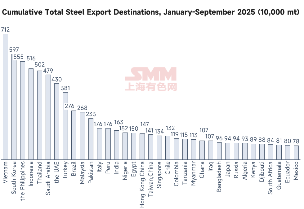 In terms of cumulative total export volume, Vietnam remained the top destination for China’s steel exports, with cumulative exports reaching 7.1204 million mt by September this year. However, it also showed the largest YoY decline, down 24.91%. The primary reason for this change is Vietnam’s increasingly stringent anti-dumping measures against Chinese steel products, with five case rulings issued so far this year. Recently, the Vietnamese Ministry of Industry and Trade (MOIT) initiated an anti-circumvention investigation on certain HRC products originating from China. According to the relevant government document (Decision No. 3176/QD-BCT, signed by Vietnamese Vice Minister of Industry and Trade Nguyen Sinh Nhat Tan on October 27), the products under investigation are HRC with widths >1,880 mm and ≤2,300 mm. The specific specifications of the products involved are flat-rolled iron or steel (alloy or non-alloy), hot-rolled, with thicknesses between 1.2 mm and 25.4 mm. However, the following products are excluded from the scope of this investigation: HRC with a carbon content >0.3% by weight; thick plates with thickness ≥10 mm; and HRC products already covered by existing anti-dumping duties. According to the SMM survey, with the ruling outcome still uncertain, some export traders are intensifying efforts to dispatch vessels to Vietnam to mitigate risks, and current wide coil order intake performance is favorable.