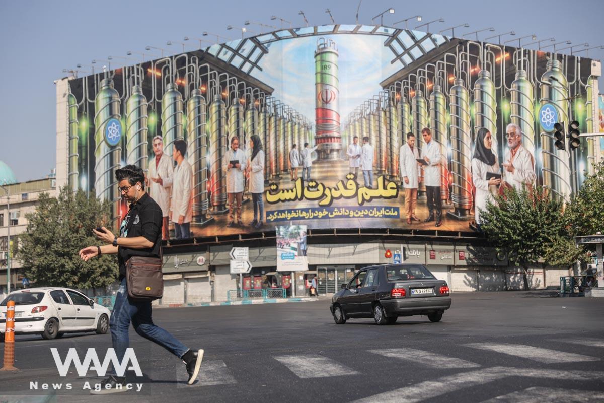 People walk past a billboard with a picture of nuclear scientists killed in Israeli strikes and Iranian centrifuges, on a street in Tehran, Iran August 29, 2025. Majid Asgaripour/WANA (West Asia News Agency)