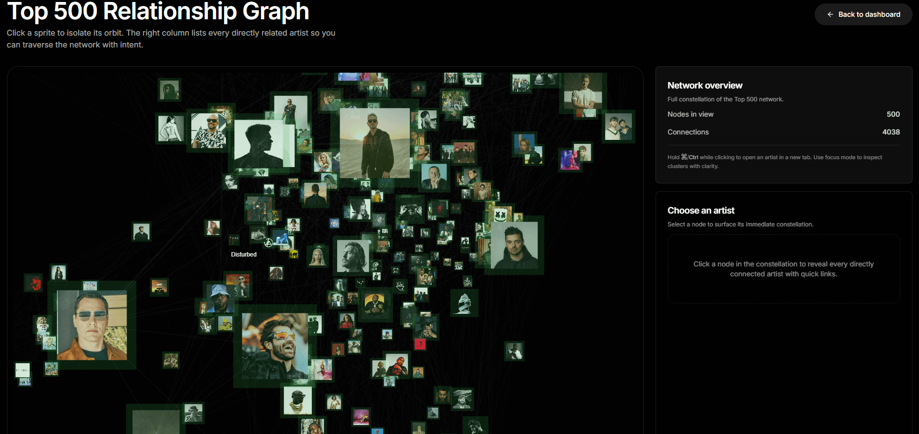 i’ve been working on a small project called world's top artists: it tracks the world’s top 500 artists, updated daily, with insights, real-time stats and discovery features.