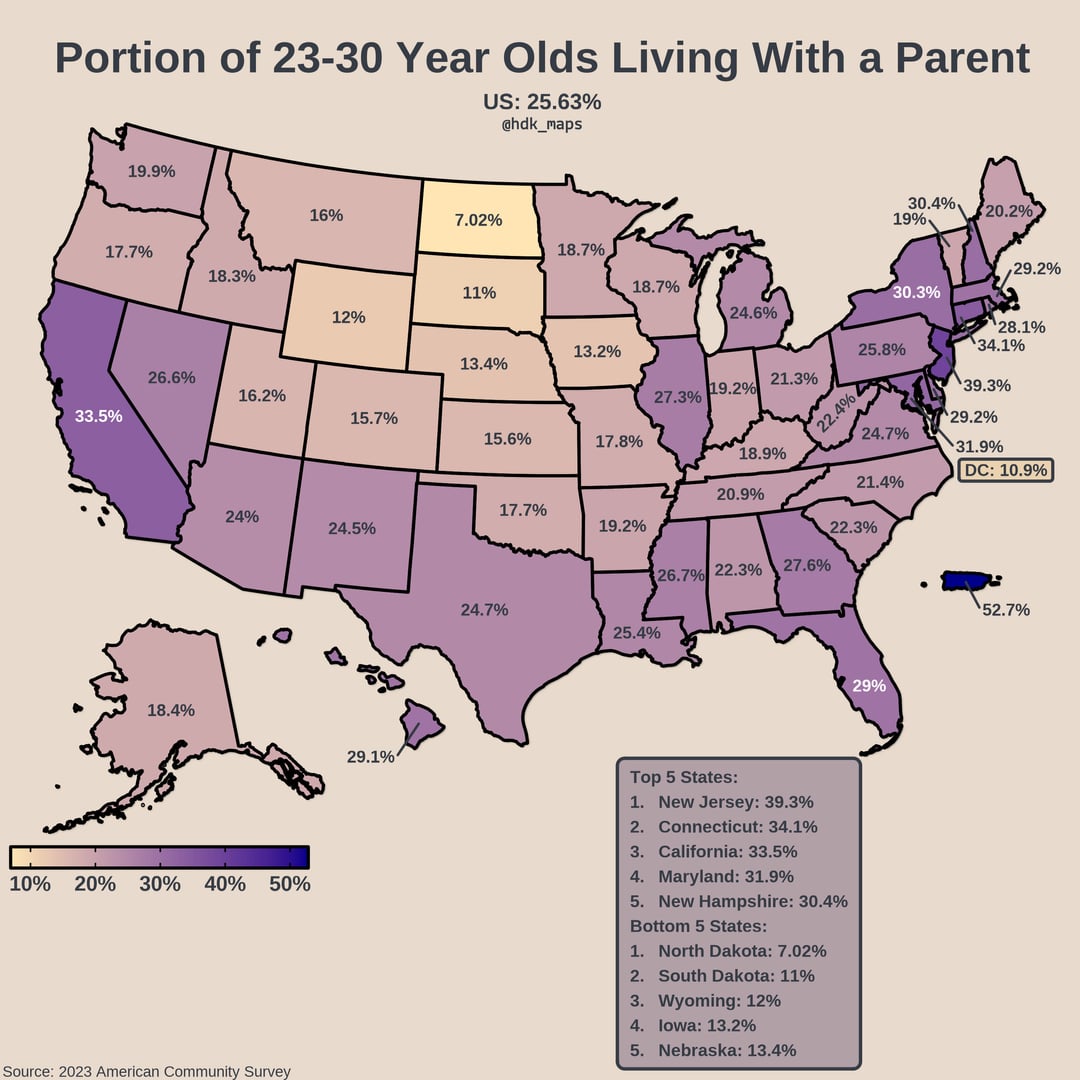 I think a telling statistic for some states would be how many young people left the state for greener pastures. So sure North Dakota might have a low percent staying at home but how many of those joined the military or moved ?
