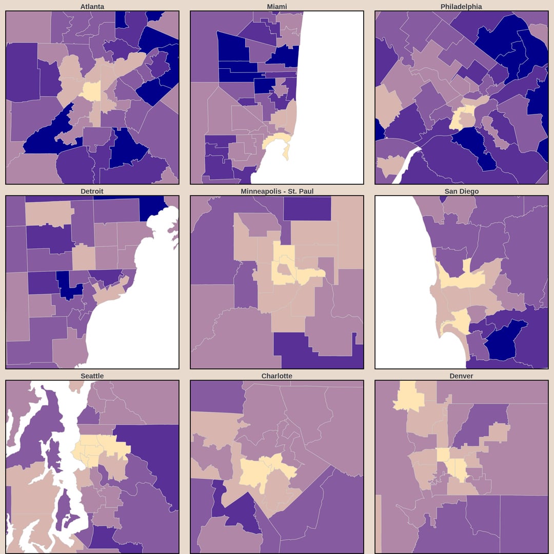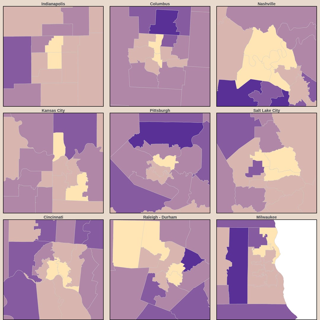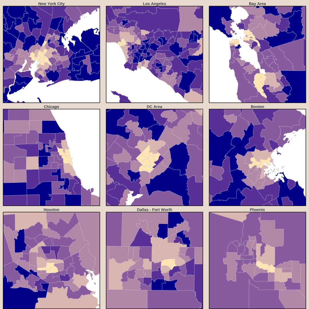 PUMA stands for Public Use Microdata Area. PUMAs are areas designated by the Census Bureau for statistical reporting. They each have between 100k and 200k residents, don’t cross state lines, and follow county and city boundaries when possible. Their big advantage over county maps is letting us see much more detail in urban areas, but it does come at the cost of being able to present all the information in one image.
