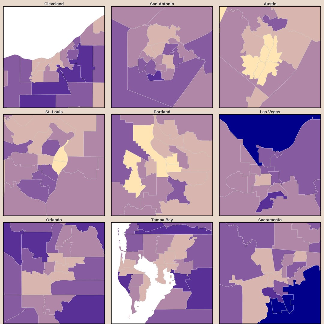 This also shows where “parents” are likely to live, in the region map. Like I know exactly why Seattle (Lake Union) is so low: It’s because all the kids with parents are gone, and it’s mostly just Amazon employees now. I bet the other areas with low rates are similar. Likewise, I expect the areas where the rates are really high are probably mostly HCOL areas that people like to retire near.