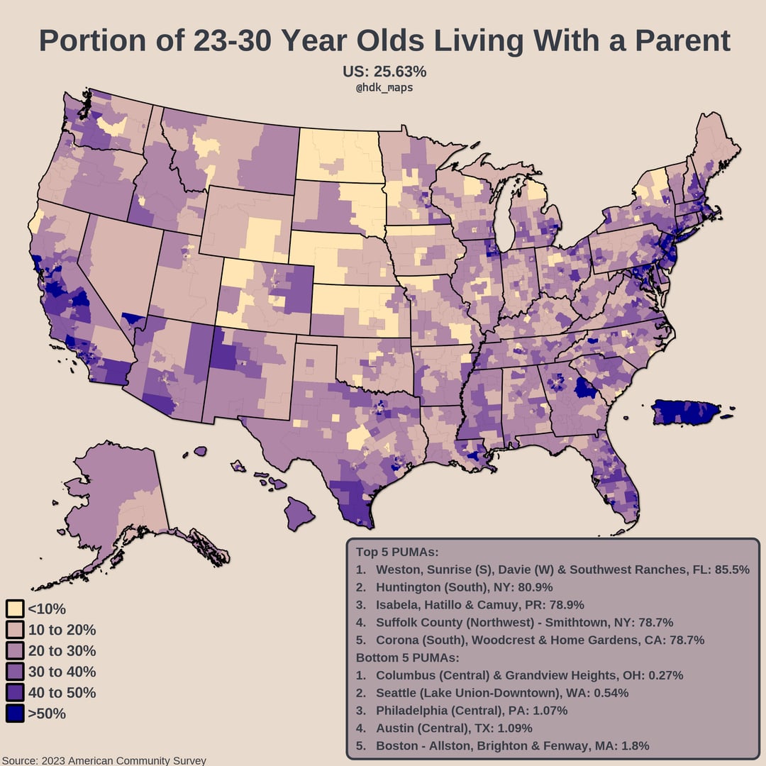 Surprised it’s this low. I still lived at home at 30 despite making $75k. It was either that or pay $1500 to live with roommates. That just wasn’t enough money to live alone unless you live paycheck to paycheck in a VHCOL area.