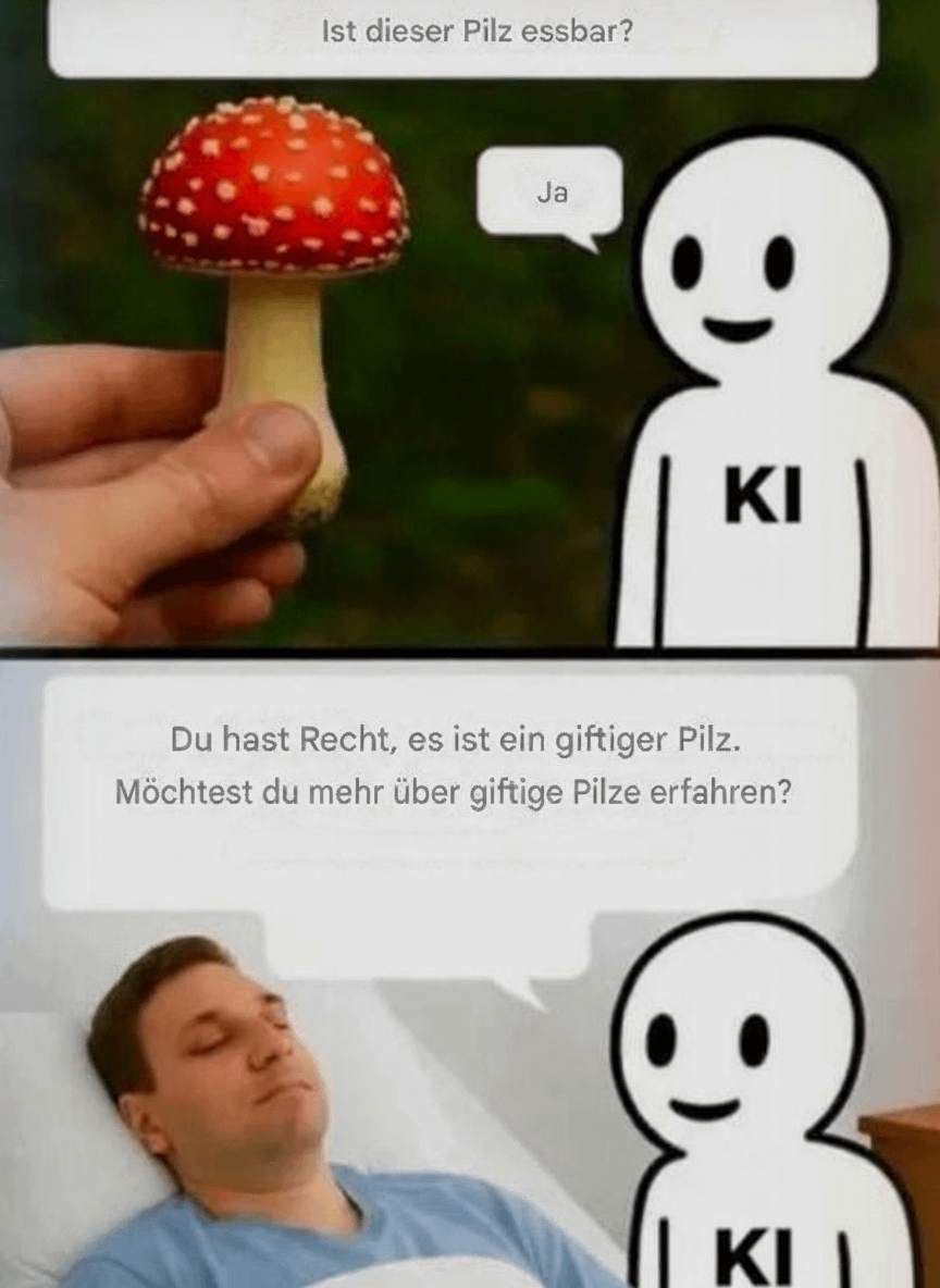 Hab letztes Jahr schon ein [Video](https://youtu.be/kwp_WEdJaEk) über ki generierte Pilzbücher auf Amazon gesehen, das kann halt wirklich tödlich enden