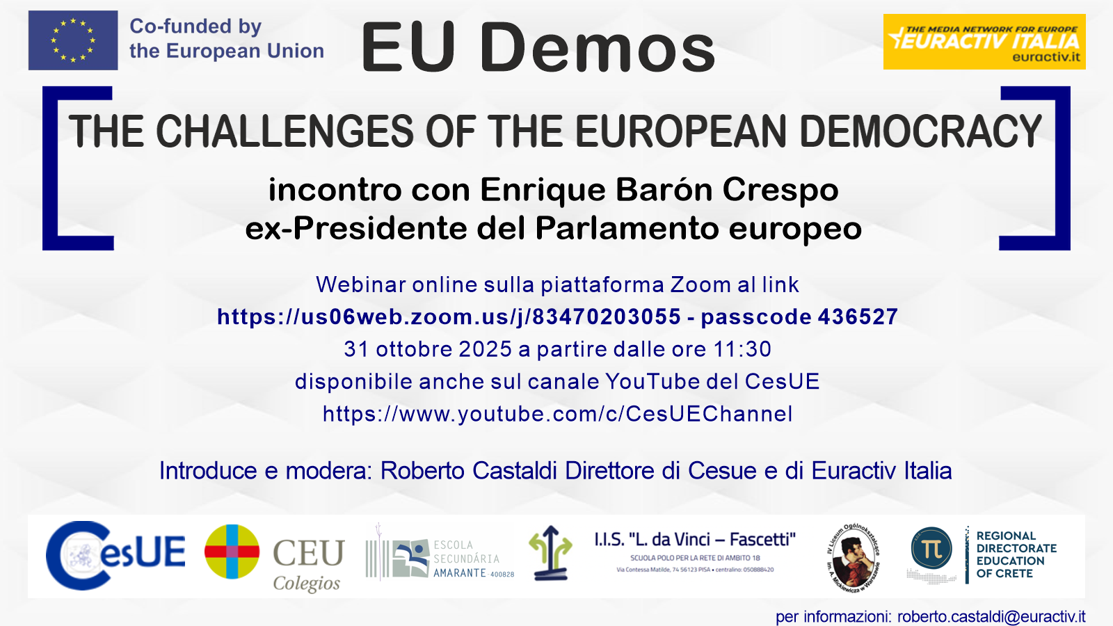CesUE e Euractiv Italia vi invitano a partecipare a “THE CHALLENGES OF THE EUROPEAN DEMOCRACY” un incontro in diretta con l’ex presidente del Parlamento europeo Enrique Barón Crespo sulle sfide più urgenti al sistema democratico alla base dell’Unione Europea edelle sue Istituzioni.
