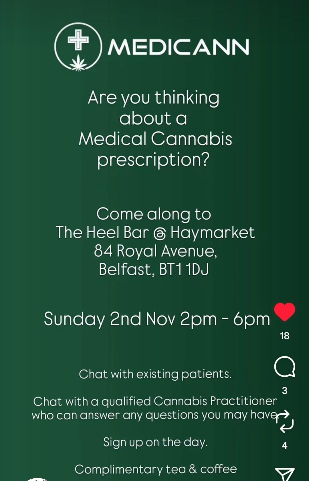 It's organised/run by Medicann, a UK wide Medical Cannabis clinic and I'm just sharing the information for the event as i think it's a great thing and will be a bit of craic as well. It's something we need more of over this side of the water as we're behind as usual with regards to awareness and stigma. The plant is here to help everyone and anyone ๐ we all have an endocannabinoid system for a reason and more understanding of this plant/medicine can only benefit us all, dare I say it. Mon down and see what the craic is sure..