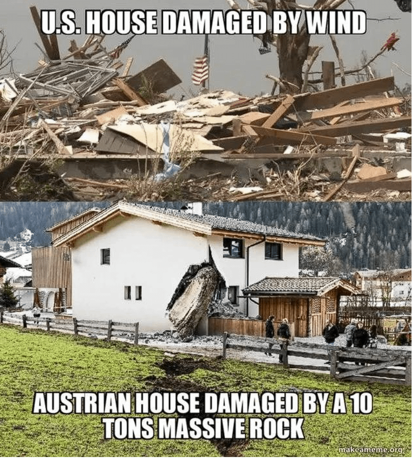 Another reason we’re “poorer” than Misspeepee on this side of the pond, no unnecessary inflation of profits on hardware stores, middlemen and contractors rebuilding everything every 6 months with cardboard walls filled with torn paper pieces