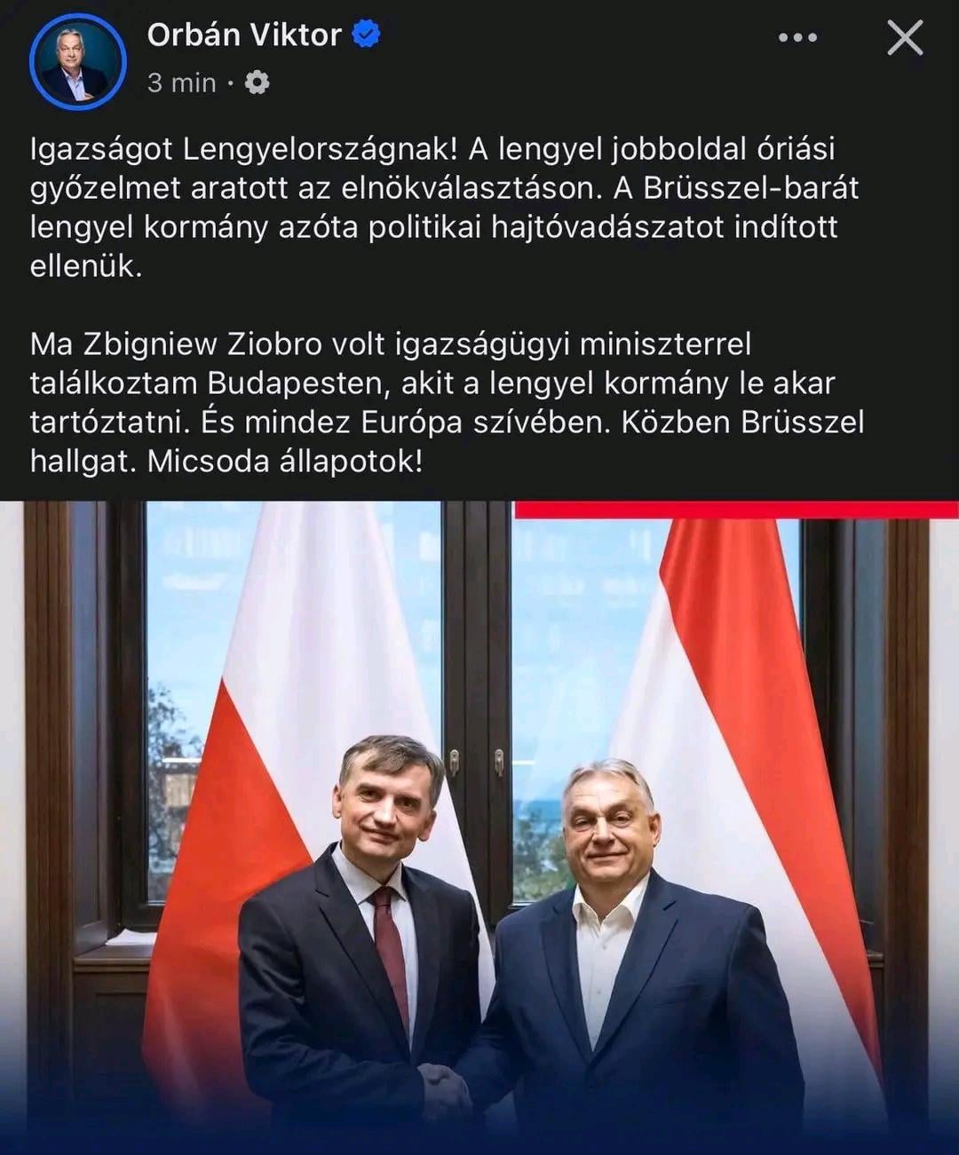 Dziś spotkałem się w Budapeszcie z byłym ministrem sprawiedliwości Zbigniewem Ziobrą, którego polski rząd chce aresztować. I to wszystko w sercu Europy. Tymczasem Bruksela milczy. Co za sytuacja!”