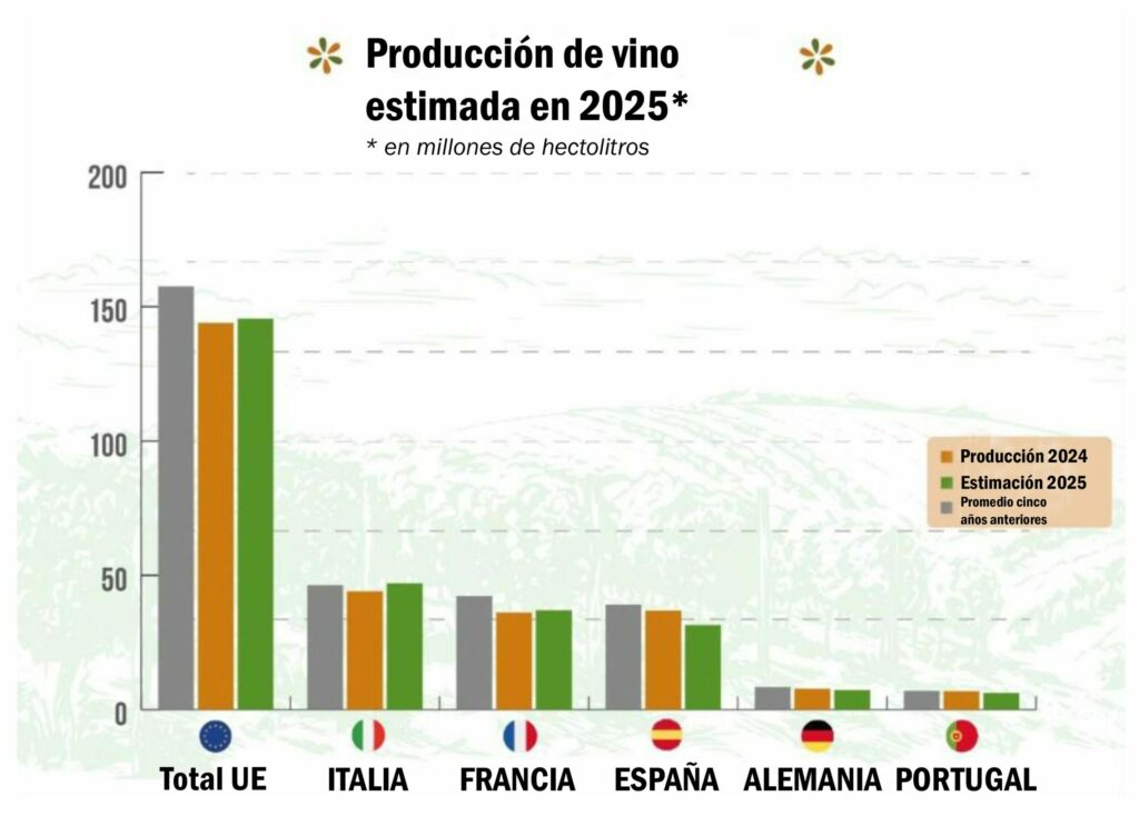 La producción estimada de vino en España en este 2025 bajará el 15 % con respecto al año pasado, al contrario de lo que sucederá con los otros dos grandes productores de la Unión Europea, Italia y Francia, donde se esperan crecimientos interanuales del 8 % y del 2,3 %, respectivamente. El sector vitivinícola europeo prevé una producción estimada de 145,5 millones de hectolitros (Mhl) de vino para 2025, lo que supone un aumento del 1 % con respecto a 2024. Aunque el volumen total de la UE se está recuperando, sigue un 7,5 % por debajo de la media de los últimos cinco años.