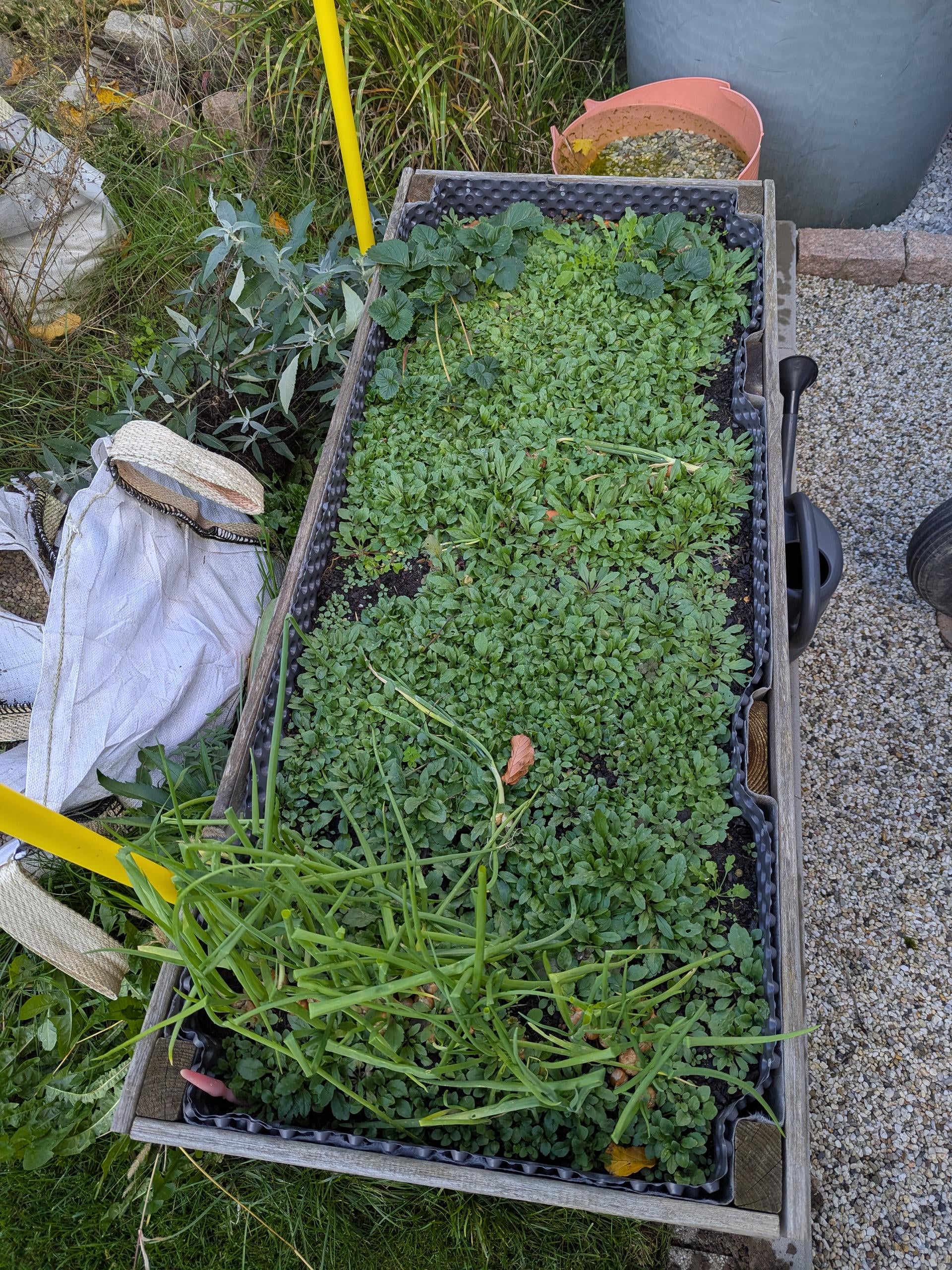 Die Zwiebeln teilen sich irgendwie in zwei wenn ich die rausziehen möchte, ich ziehe im Prinzip eine Frühlingszwiebel raus und die Außenhaut bleibt in der Erde. Oben sind Erdbeerpflanzen, die würde ich gerne retten, weil die ein Geschenk meiner Nachbarin waren. Was dazwischen wächst weiß ich nicht so genau 😬