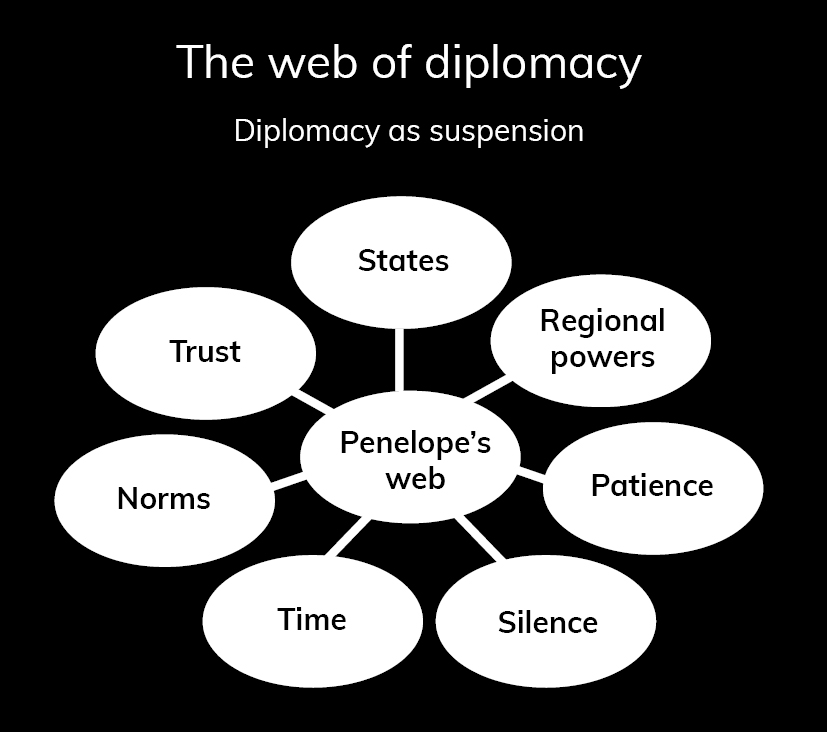 Diplomacy often turns delay into power. Penelope understands this logic; her silence is action, her time is political