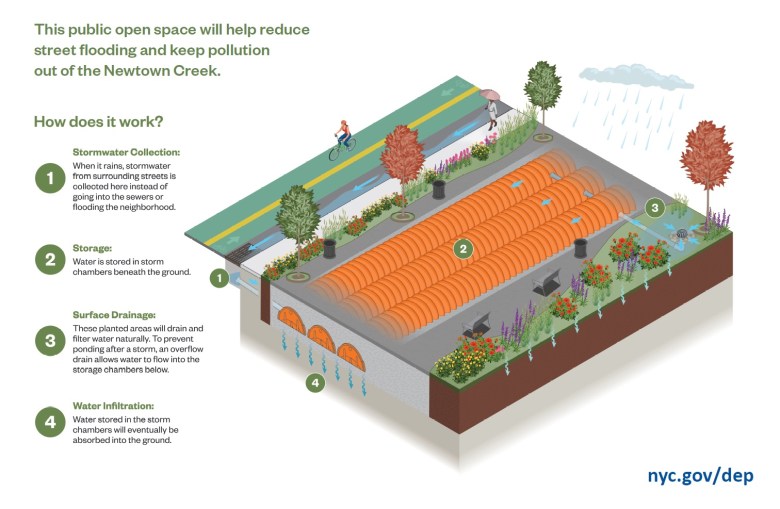 A parcel next to the Newtown Creek Resource Recovery Facility “will be transformed into a vibrant community space equipped with underground stormwater storage chambers capable of capturing nearly one million gallons of stormwater annually,” a DEP press release reads.