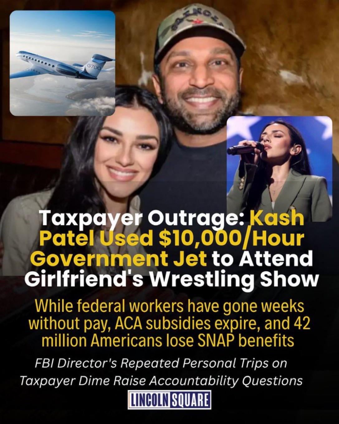Cash Patel treating Air Force jets like UberXL. $10K/hr to attend and pick up his girlfriend from a wrestling show — truly the people’s government. 😂