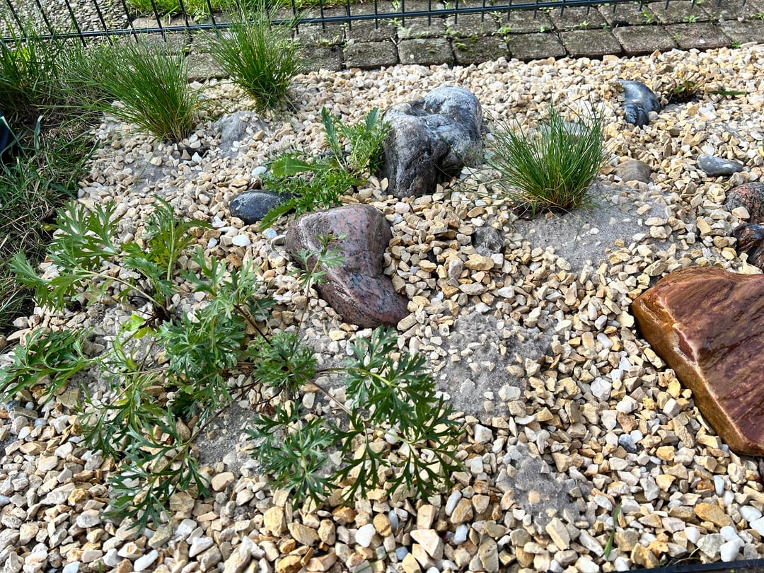 Edit 2: Weil es einige Verwirrung gab, zur Klarstellung: Das ist KEIN Schotterbeet, wie sie in vielen Bundesländern verboten sind. Das ist ein Magerbeet, ein bisschen einem Kalk-Schotterhang in der Natur nachempfunden. Die Pflanzen sind alle in Deutschland heimisch. Ich habe auch versucht hauptsächlich lokal heimische Arten aus meiner Gegend zu verwenden, ist aber natürlich schwierig, wenn man im Norddeutschen Tiefland wohnt, wo es eher sauer als kalkhaltig ist. Dennoch sollten 80 % in meinem erweiterten Raum natürlich anzutreffen sein, wenn manche auch echt selten (Kreuzenzian zum Beispiel gibt's nur noch extrem selten in Niedersachsen).