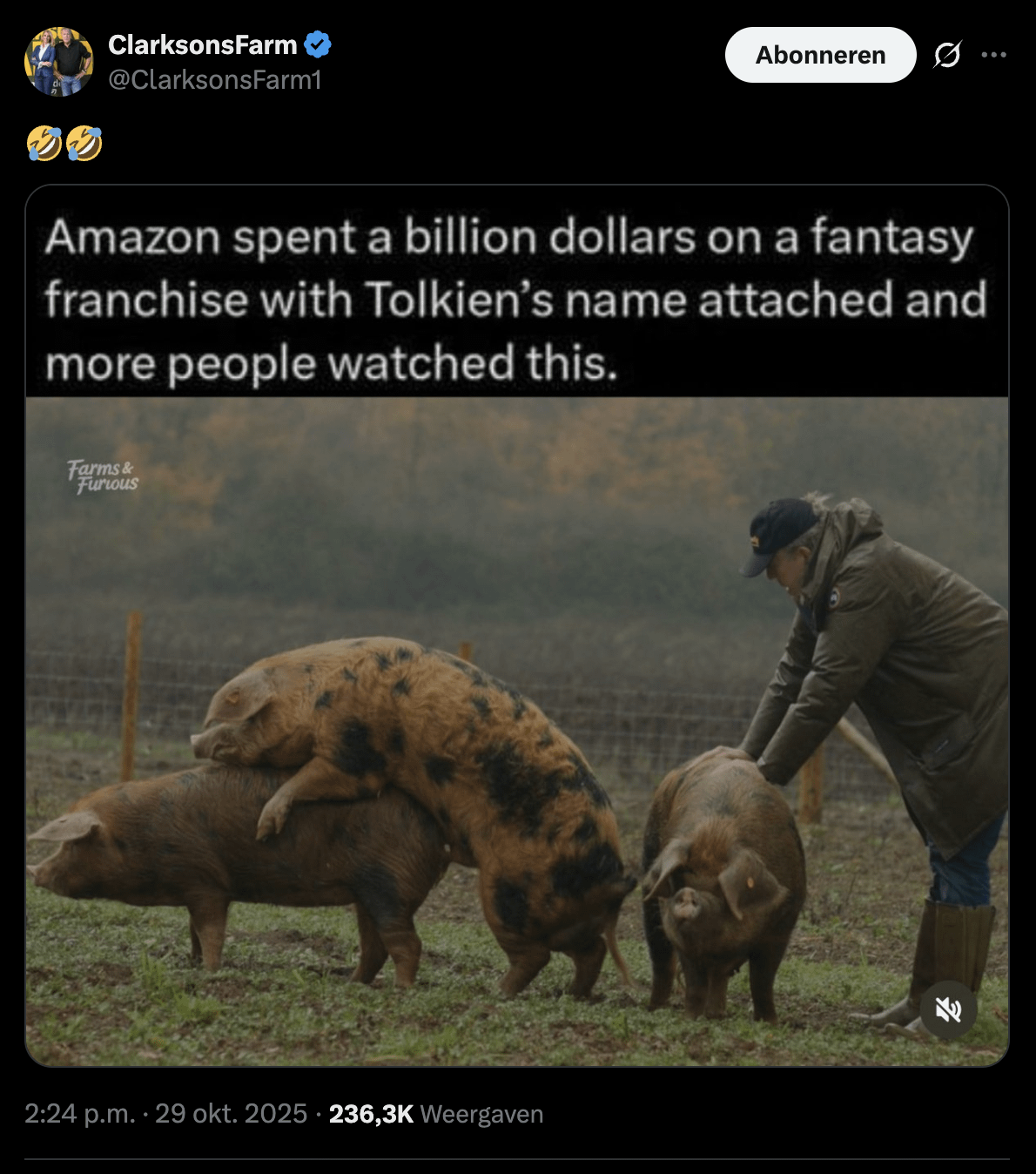 To be fair, clarksons farm was better then the lord of the rings show. Maybe it was great for super nerdy Tolkin Fans, who love the lore, but it was really boring.