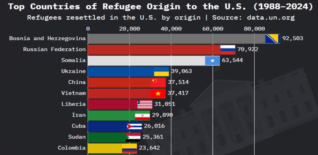 The data comes from UNHCR and the U.S. Department of Homeland Security’s Yearbook of Immigration Statistics . 2001, Bosnia & Herzegovina dominated that year, followed by Vietnam, Somalia, and Ukraine.