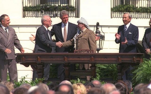 Former US president Bill Clinton looks on as then prime minister Yitzhak Rabin and PLO head Yasser Arafat shake hands during the signing of the Oslo Accords, September 13, 1993. (Courtesy/GPO)