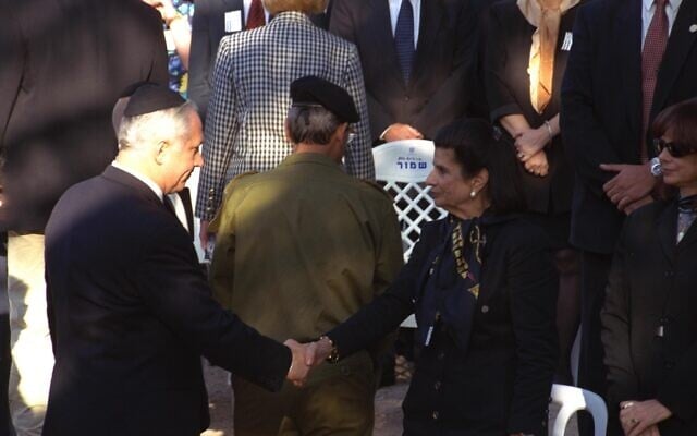 The late Leah Rabin, wife of assassinated prime minister Yitzhak Rabin, shakes then-MK Benjamin Netanyahu’s hand at the memorial service marking two years since Rabin’s death, November 12, 1997. (Moshe Milner)
