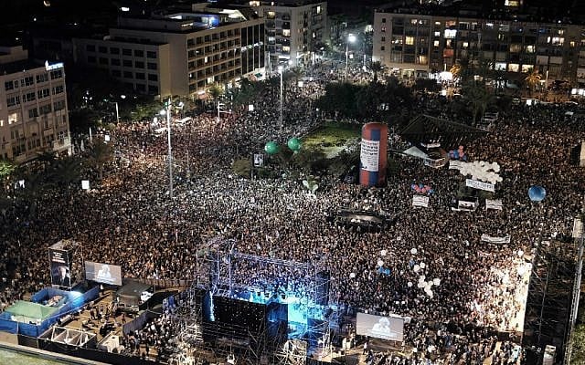 Some 100,000 attend a rally marking the 20th anniversary of the assassination of Israeli prime minister Yitzhak Rabin in the same Tel Aviv square in which he was killed during a 1995 peace rally, in 2015. (Flash90/Tomer Neuberg)