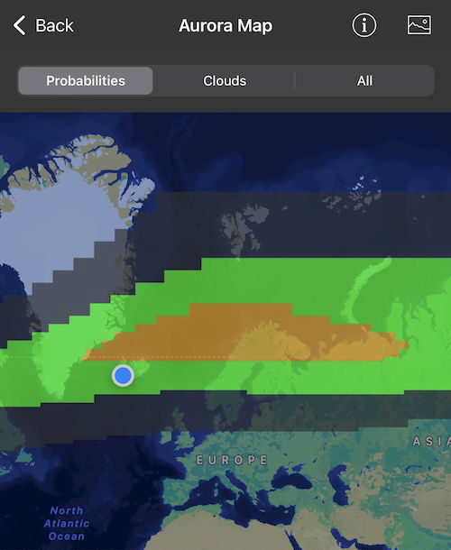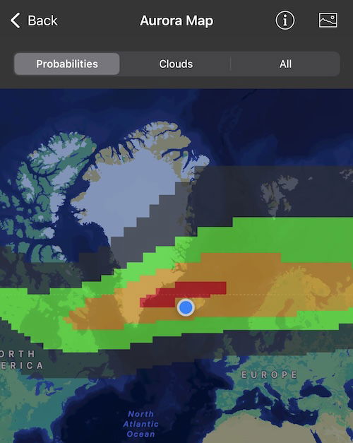 The hotel also offers a Northern Lights wakeup call, which we had requested. However, we didn’t even end up needing that. Around 9PM I noticed that conditions looked quite good in the app.Aurora app lights map