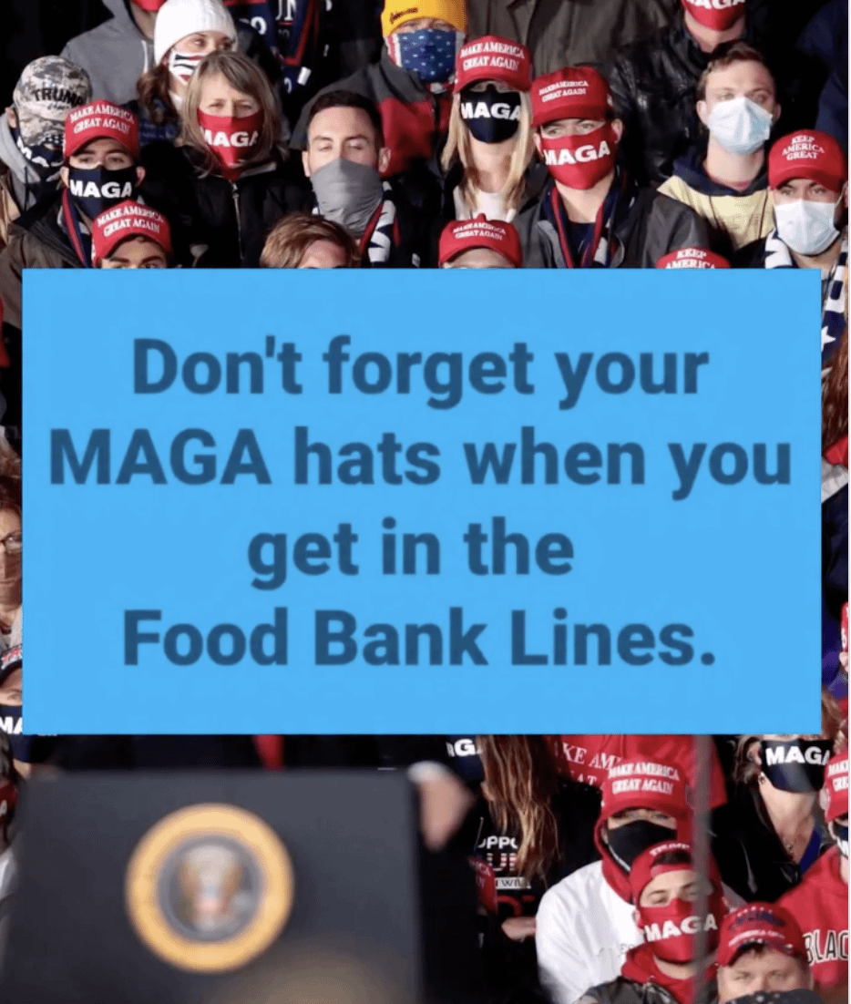 2. As a foodbank volunteer, I can assure you that they 100% wear the MAGA gear when they are collecting their food. Personal favorite was the guy last week, who tried to tell me that it’s the illegals that are the problem. Sure, buddy. THAT is why you’ve been coming here since 2018