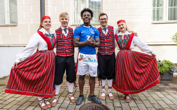 Youtuber Darren Jason Watkins Jr., known as IShowSpeed, with folk dancers at Stenbock House on July 15, 2025. Source: Jürgen Randma/riigikantselei