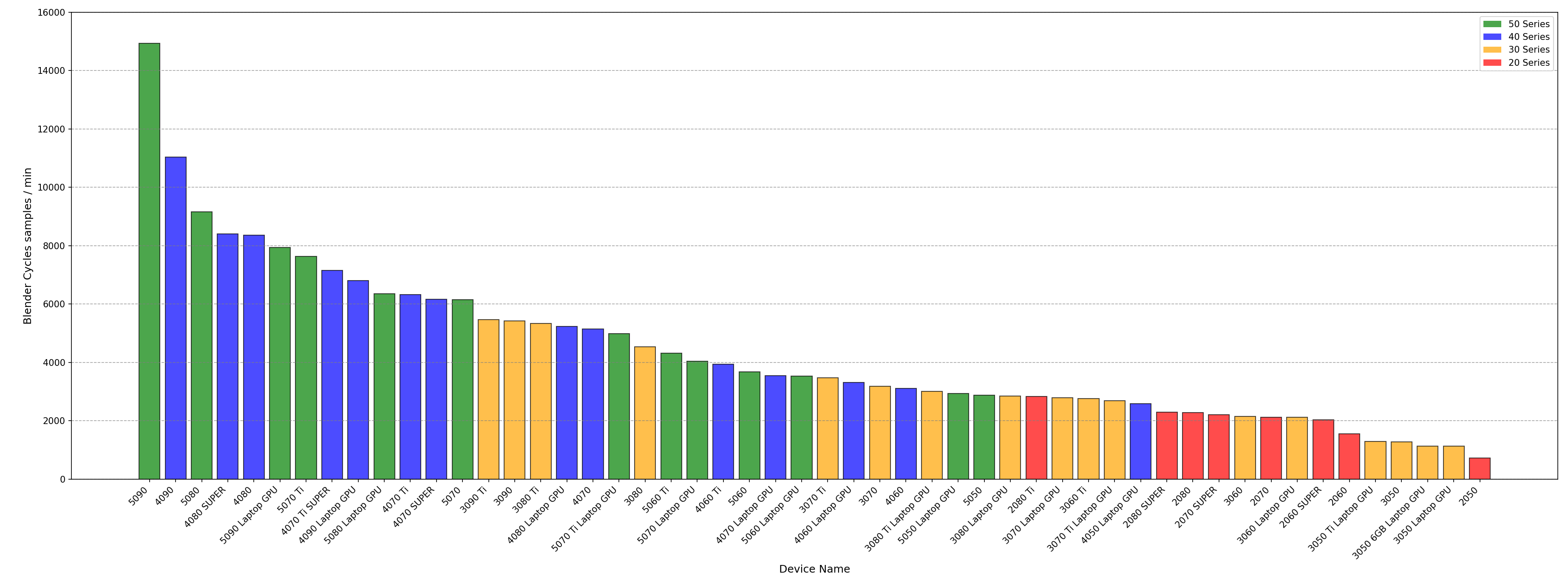 Source: [https://opendata.blender.org/benchmarks/query/?compute_type=OPTIX&compute_type=CUDA&blender_version=4.5.0&group_by=device_name](https://opendata.blender.org/benchmarks/query/?compute_type=OPTIX&compute_type=CUDA&blender_version=4.5.0&group_by=device_name) Chart created using: Python with pandas, matplotlib and numpy