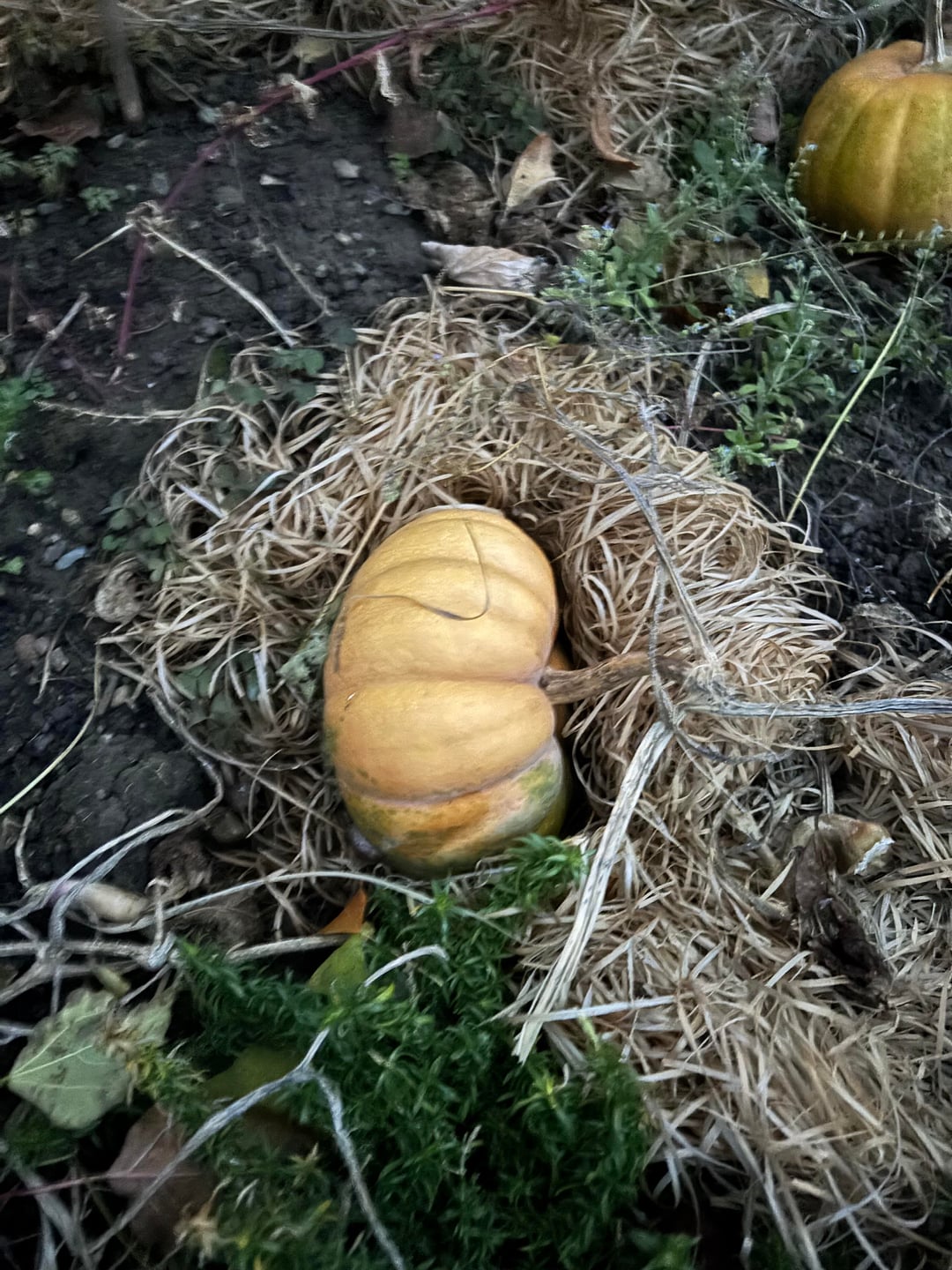 Von der Pflanze bekommt der Kürbis nichts mehr. Gibt also keinen Grund ihn dran zu lassen. Möglicherweise gammelt er dir bei dem nassem Wetter wenn du ihn dranlässt.