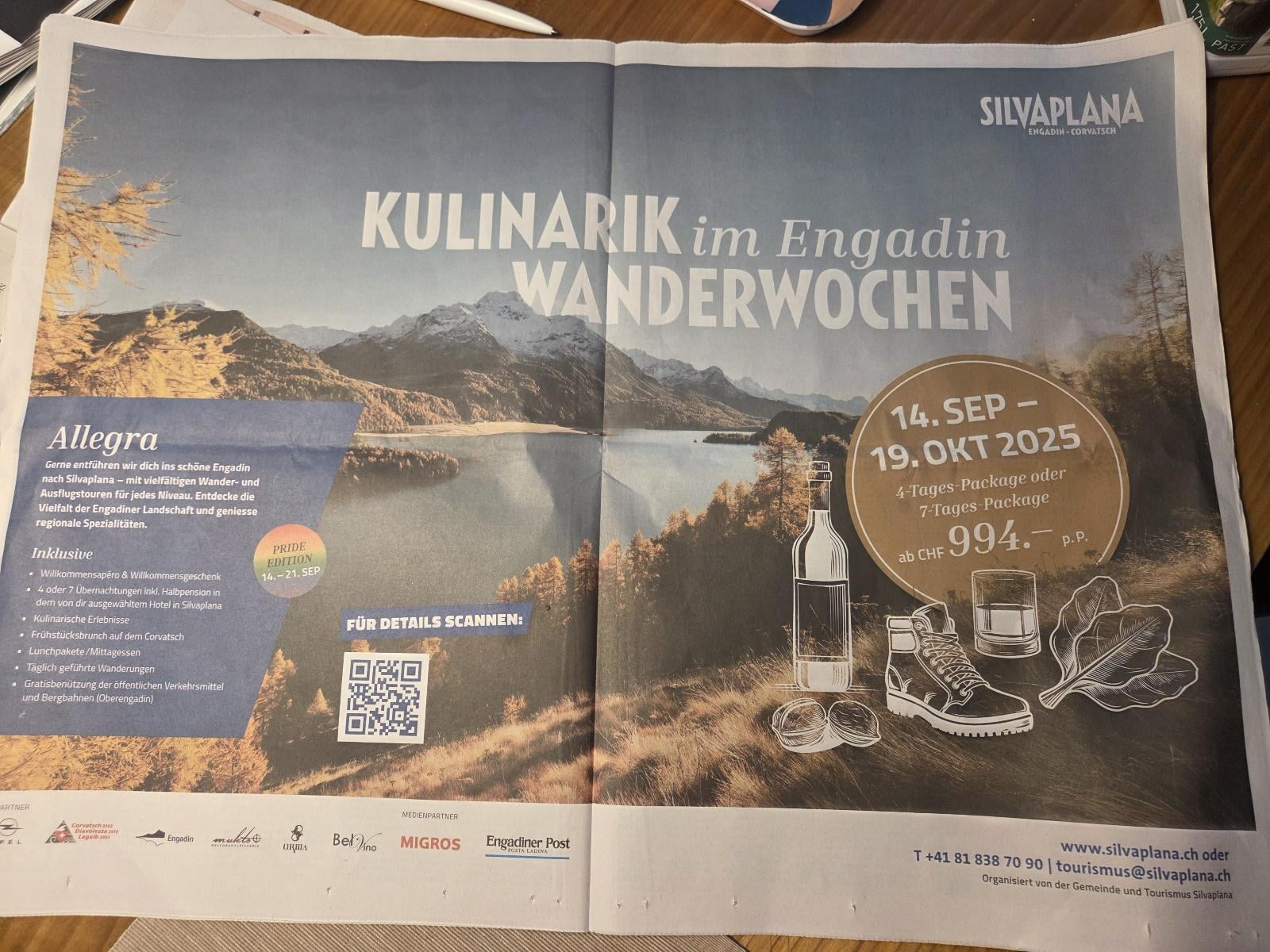 No marketing intended, but I found this centerfold gem in todays Sonntagszeitung. I just wonder if the guys over at Silvaplana tourism had a couple of Rötelis too much. Unless it's a pirate type of commercial (hey, works on Reddit…) they sunk probably a low 5 digits.