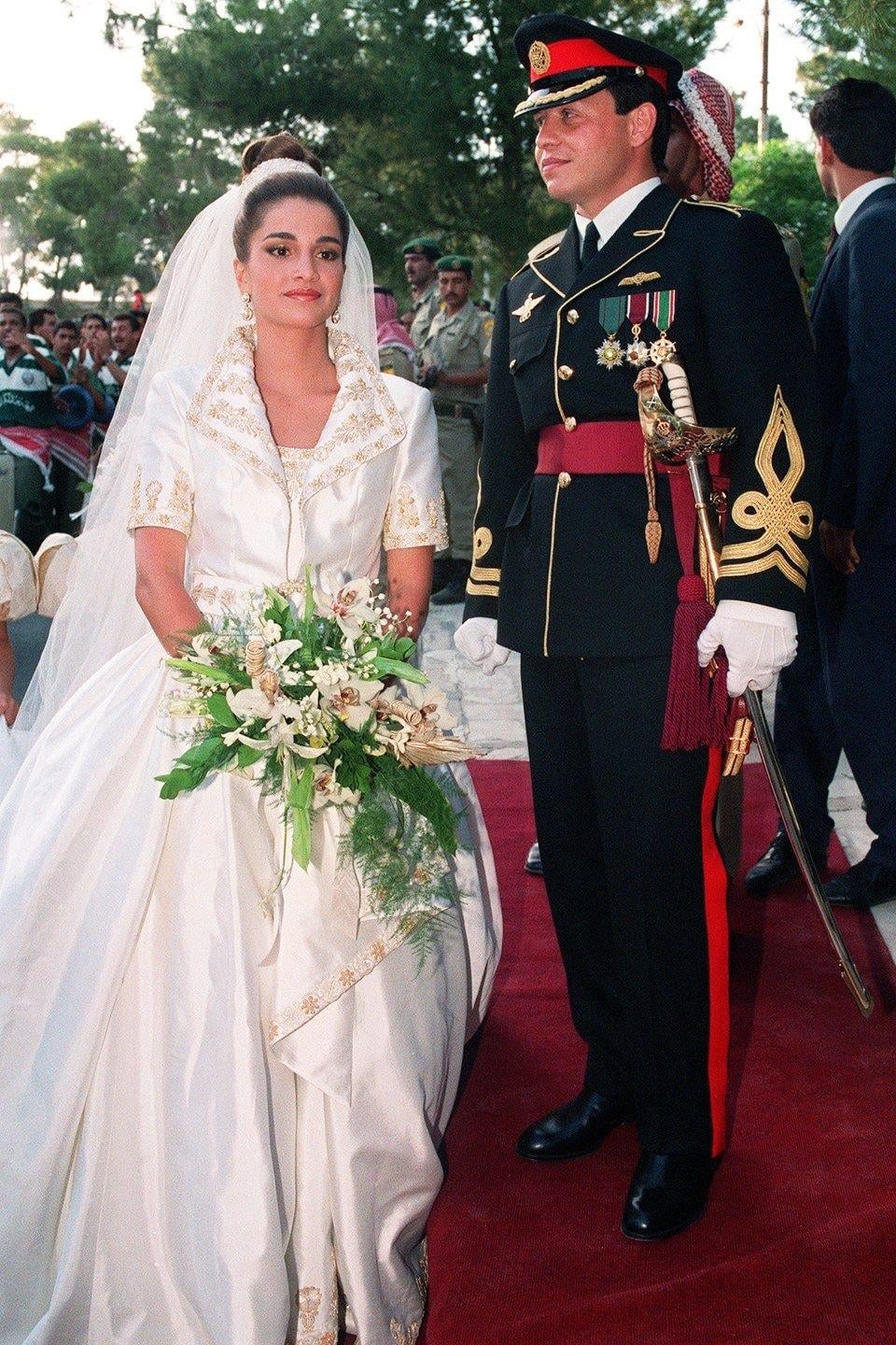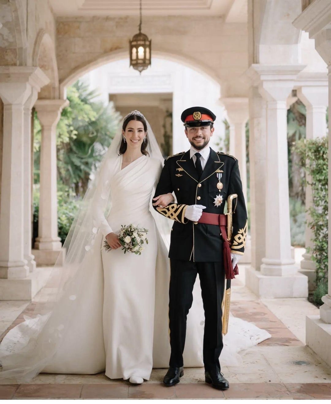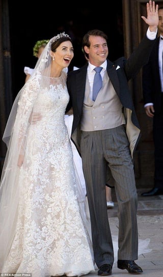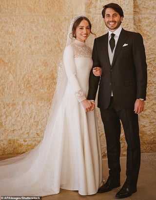 I don’t love the asymmetrical neckline on Rajwa’s dress, but she and Hussein both look great! Such a cute photo.