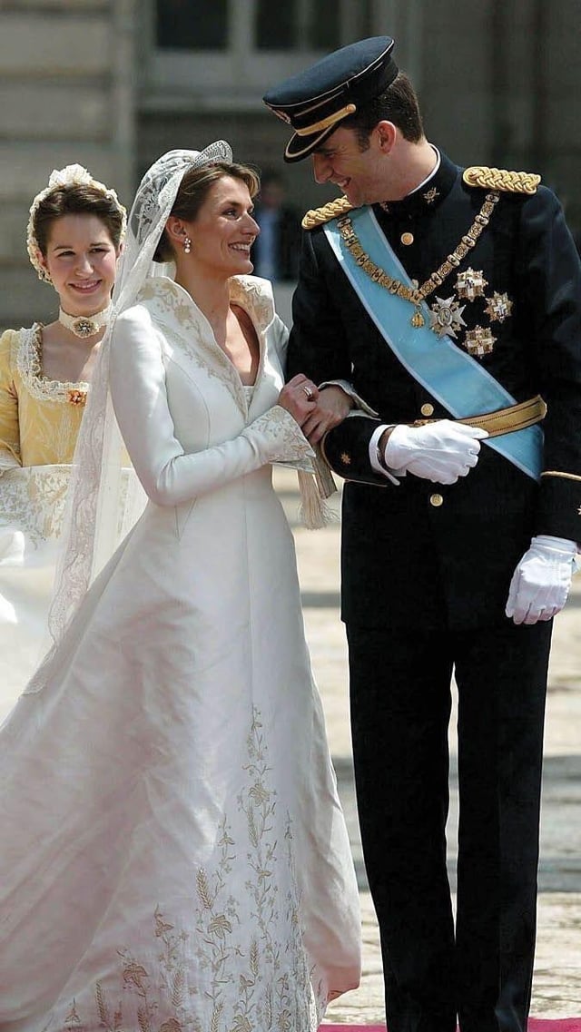 The weird milkmaid bridesmaid dresses are terrible, but I will always love Letizia’s gorgeous dress. That neckline sets her beautiful swanlike neck and throat,and her collarbones, off perfectly without being too revealing. The rich fabric and restrained embroidery make me happy, too.