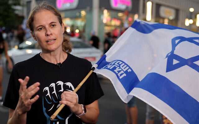 Protest leader Shikma Bressler speaks to reporters during a protest against the judicial overhaul in Tel Aviv on July 18, 2023. (Jack Gueez/AFP)
