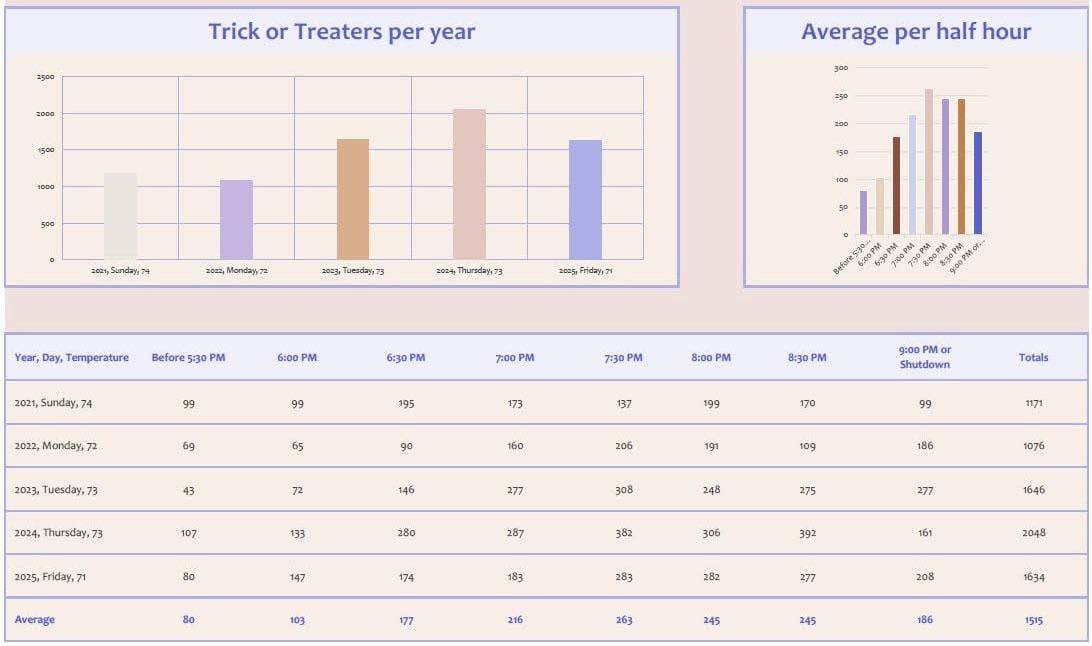 Data is from my dad who moved to a high density area about 4 years ago, and he started tracking Halloween visitors in Excel. He’s starting to display the data with graphs for fun, so I’m looking for any suggestions for him to try out or new data points to collect.