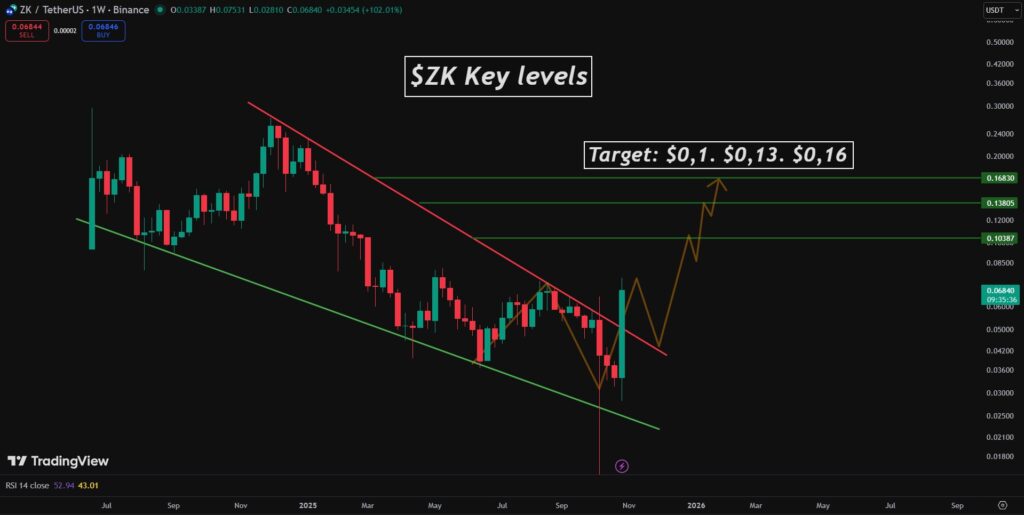 Prominent analyst Solberg Invest highlights that the ZK crypto has broken out of a falling wedge, with $0.1, $0.13 and $0.16 as mid-term targets.