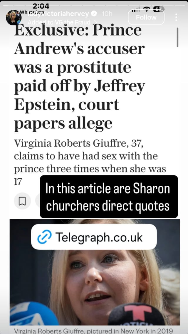 Andrew's former girlfriend Lady Victoria Hervey, has once again taken to Instagram to post a string of stories implying that Virginia Giuffre was a prostitute and a liar. She’s previously called Giuffre a “complete whore,” reposted a photo of a bruised Giuffre in a hospital bed with the word "KARMA" written across it, and even shared a link to a report about Giuffre’s suicide with the caption, “When lies catch up with you there’s no way out.”